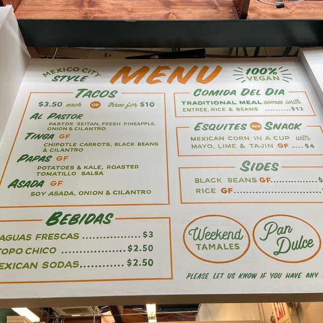 From left to right: Al Pastor, Asada, and Potaoes and Kale. There are zero flaws in this meal. It’s an all-star line up. Perfect score! It’s in a farmer’s market with lots of other food but don’t stray because this makes its mark! And you control the heat with that sauce!