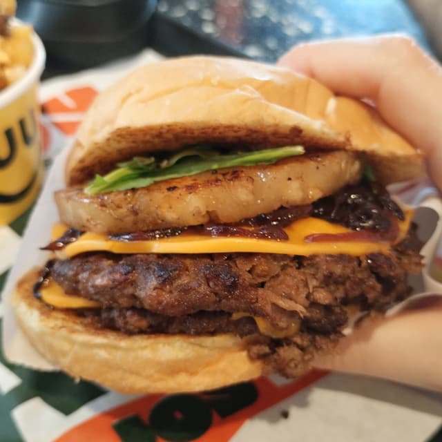 RIQUÍSIMA, es una hamburguesa absoluta hecha para los amantes del agridulce y picante, es una bomba de sabor, la combinación de ananá grillado y salsa tabasco es inesperadamente RIQUÍSIMA. Mi favorita lejos, recomendadísima.