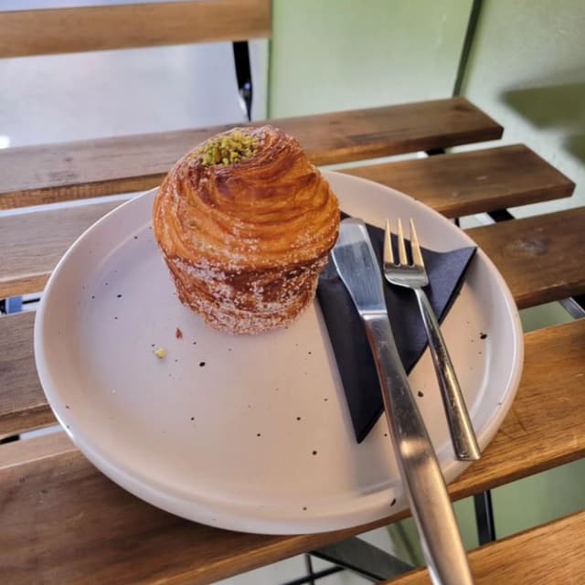 Pistachio #cruffin is a delightful fusion of a #croissant 🥐 and a #muffin 🧁 The exterior is beautifully golden-brown and crispy, with delicate, flaky layers that shatter gently as you take your first bite #sweettooth Inside, the cruffin reveals a tender, #buttery interior, reminiscent of a perfectly baked croissant, but with the satisfying heft of a muffin. Each layer is light and airy, offering a delightful contrast to the crisp exterior.