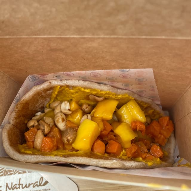 Pita farcita con ingredienti a piacere. Sono presenti due scelte vegane: le falafel il pulled planted. Questa è condita con falafel, hummus ai piselli, riso, mais, pomodori secchi, fagioli.