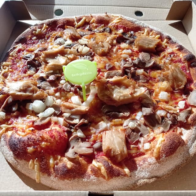 alejandro-alvaro5 years agoSee TranslationTelepizza ha sacado tres pizzas veganas. Están ricas (al nivel de sus pizzas). Llevan bastante queso vegano. Son un poco caras, pero con la oferta 2x1 se quedan bien. El no-pollo es de heura.0