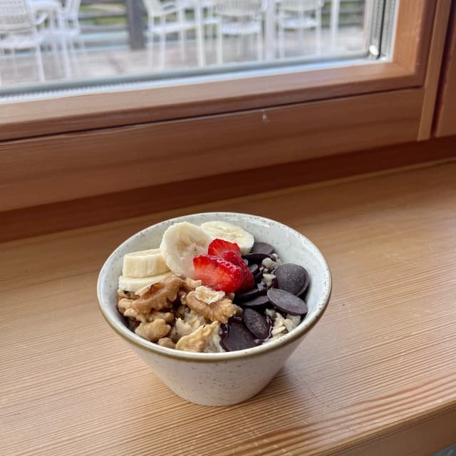 Porridge di avena con cioccolato fondente,banane,fragole e noci. Buonissimo,ho lasciato che si sciogliesse un pochino il cioccolato fondente visto che il porridge era tiepido,porzione abbondante,mai mangiato così buono! #porridge #avena #colazionevegana #rifugiomiletta #veganhotel #dolomiti