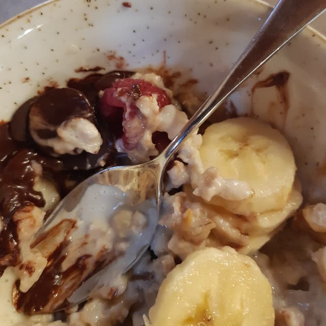 Foto brutta di porridge buono smangiucchiato! 😬 Avena, noci, banana, ribes, lamponi e cioccolato fondente.