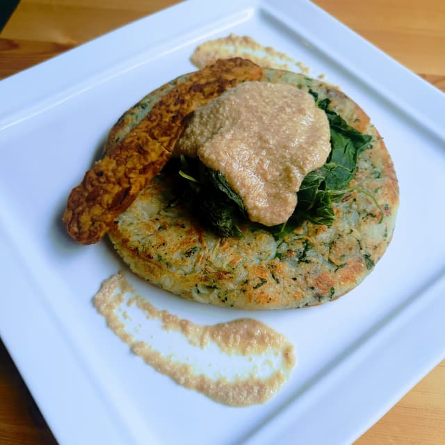 A hearty #carbivore #breakfastofchampions; that slab of #potato is much larger than it looks (plate is enormous and I zoomed too far in so we have lost all contextual reference 😅) I would've preferred it had the #tempeh actually tried to replicate the texture and taste of #bacon, I'm big on realistic substitutions. But otherwise I enjoyed the #rosti with a generous amount of boiled #spinach and a delicious #cashewcream spread 😋