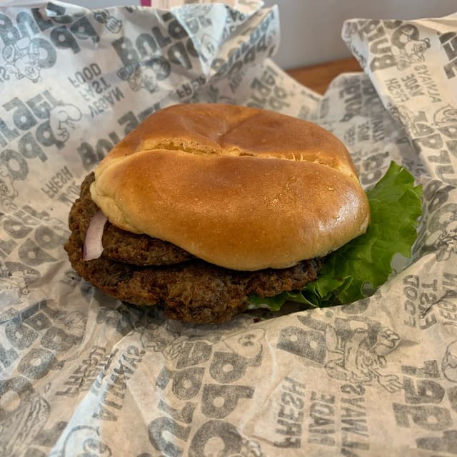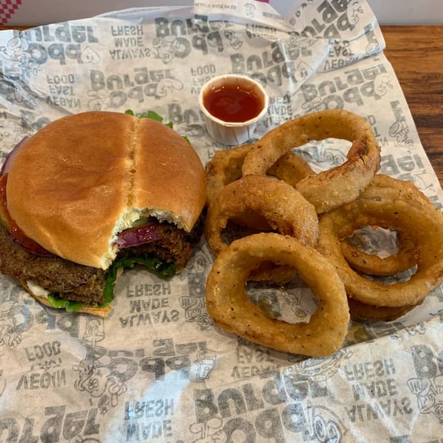 #vegan #veganisnotscary #veganfastfood #allveganfastfood #oddburger #preposterousburger #smashpatty Usually I go to Odd Burger to celebrate my dogs who have passed away, but this time, it was a promotion that enticed me to go to Odd Burger. The promotion was half price BacUn Famous Melt Burgers (until October 31). Ironically, I chose something else on the menu - a Preposterous Burger Combo (burger, onions, soft drink). This review is only for the Preposterous Burger. Again, Odd Burger came through with another delicious burger. The Preposterous Burger is basically a plant-based / vegan double burger. According to the restaurant’s website, it is “A double 'meaty' sensation, featuring our house-made smash patties on a toasted golden bun with just the right balance of toppings. You'll find it hard to believe that this is made from plants!” The Smash Patties are “Two house-made patties crafted from wheat and soy protein, flax seeds, onions, nutritional yeast and a special seasoning blend.” And they’re topped with mayo (“House-made dairy-free mayo made with organic soy milk.”), ketchup, mustard, pickle slices, red onion slices and a lettuce leaf. It was so good! I really like how the patties didn’t have that mass- produced uniform look.  I’m sure it’s not the healthiest burger around, but I’ll take it any day over meat burger.  The Preposterous Burger combo was $18.61, including tax and the small premium for getting onion rings instead of the default french fries. I would definitely get this again.