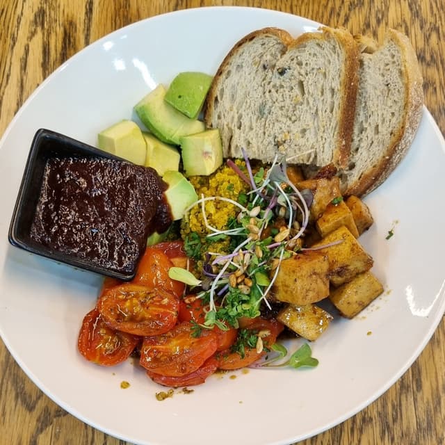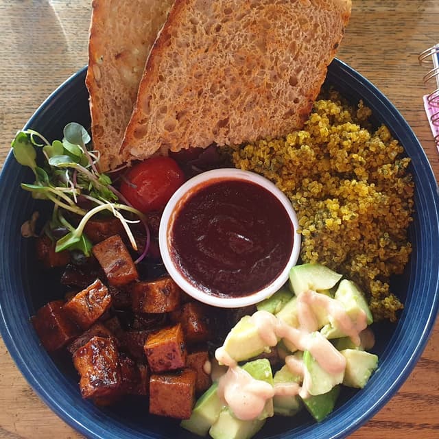 A vibrant and tasty #breakfast bowl with delicious ingredients such as #avocado , #pesto #quinoa , #tomatoes , #peashoots, #tofu and #toast . There was also a #bbq #sauce on the side of which I used only a little bit. My favourite was the quinoa mixed with pesto. Absolutely delicious. Even though the dish was #expensive, I did enjoy it and found it delightful. I did notice a lot of the prices on the menu were much higher than before.. Still happy to see a busy #vegetarian & #vegan restaurant. 🍅🌿🥗🥑🍞