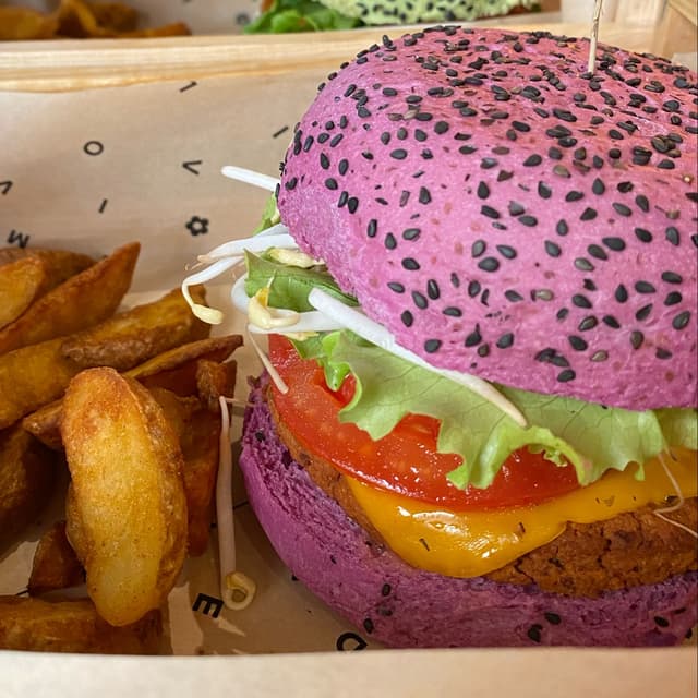 “Un fiore in bocca può servire sai, più allegro tutto sembra” cantavano Battisti e Mogol. Ed è proprio questa la mission di Flower Burger, la prima veganburgheria nata nel 2015 nel cuore di Milano, in continua espansione sia in Italia che all’estero. Il fiore come espressione di positività, gioia e amore. Un legame con la natura che si declina nelle tonalità dell’arcobaleno con una proposta culinaria 100% vegan: burger la cui caratteristica fondamentale è il colore. Si passa dal pane giallo fatto con la curcuma, al viola grazie alla carota nera fino all’amatissimo rosa, ottenuto grazie all’estratto di ciliegia. Il team di Flower Burger è sempre alla ricerca di nuove colorazioni naturali e di nuovi ingredienti per stupire e colpire i nostri clienti. Jungle Burger, Flower Burger e Cherry Bomb sono solo alcune delle proposte offerte accompagnate da patate profumate alla paprika, edamame o patatas buenas. Germogli di soia, tofu, ceci e quinoa sono ormai divenuti cibi del nostro quotidiano e Flower Burger sa come abbinarli per creare un burger dal sapore esplosivo che faccia innamorare tutti. Uno concept nato dall’idea di Matteo Toto, giovane imprenditore, che ha intrapreso un viaggio alla scoperta di gusti e sapori e alla ricerca del punto d’incontro perfetto tra l’hamburger e la cucina vegana. Una volta varcata la soglia del locale si è accolti da un’atmosfera friendly che ammicca alla cultura dei “figli dei fiori”. Il locale ospita pareti grafiche colorate e psichedeliche mescolate ad atmosfere del mondo del clubbing, dando vita a un divertente gioco di luci. Un sottomarino campeggia sulle pareti a ricordarci il Yellow Submarine dei Beatles e dietro ad una tenda colorata anni ‘70 si trova la cucina, il luogo dove nascono le nostre creazioni!