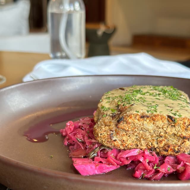 A combinação do quibe com a salada de repolho é bem interessante. Gostei bastante! Alem disso o local é todo vegano (hotel e restaurante) e bem ao lado da praça capivari em Campos do jordao.