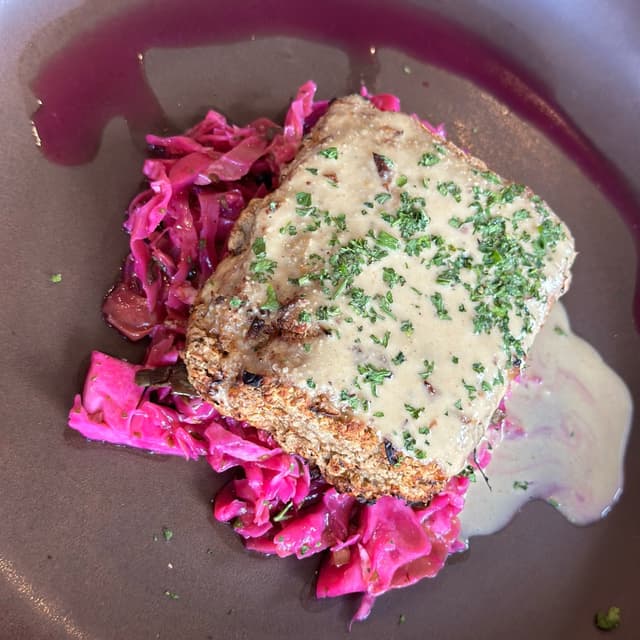 Caramelizada, com coalhada de hortelã e salada ácida de repolho. Um prato muito saboroso! Todos os ingredientes combinaram muito bem.