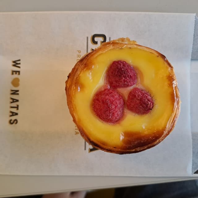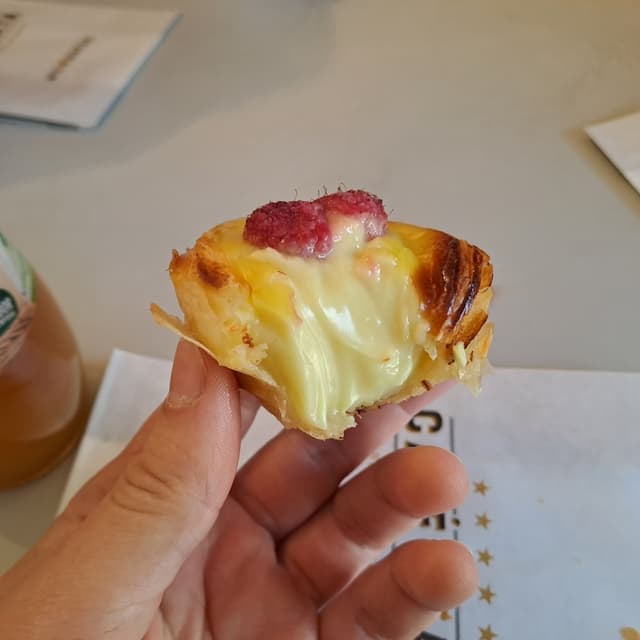 In sostanza è un cestino di pasta sfoglia con dentro questa specie di crema pasticciera e sopra in questo caso delle raspberries, e cavolo se è buono, non me lo aspettavo proprio, inoltre siamo stati fortunati perché erano stati appena sfornati.