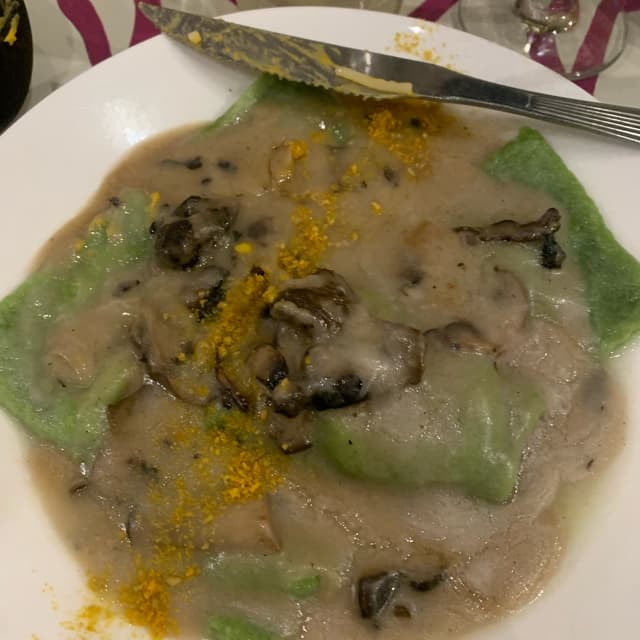 Raviolones De Masa De Espinaca , Rellenos Con Calabaza Cabutia Asada, Cebolla Caramelizada, Quesofu Y Nueces, Con Salsa Bechamel De Coco Y Hongos
