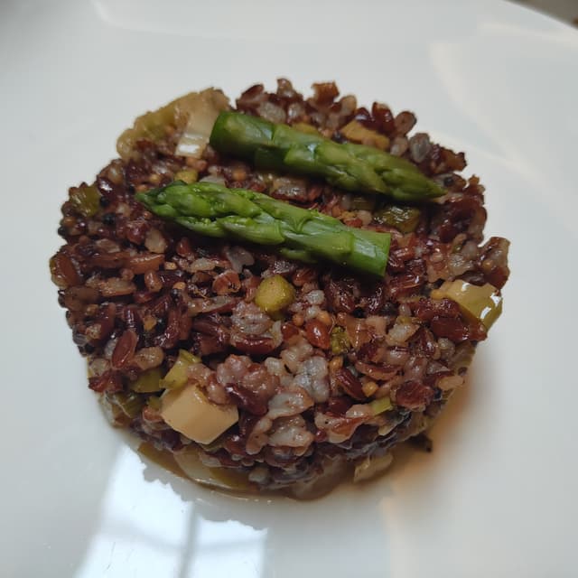 Sformatino di riso rosso selvaggio con asparago, mela cotta, spezie varie. Delizioso, arriva a tavola caldino