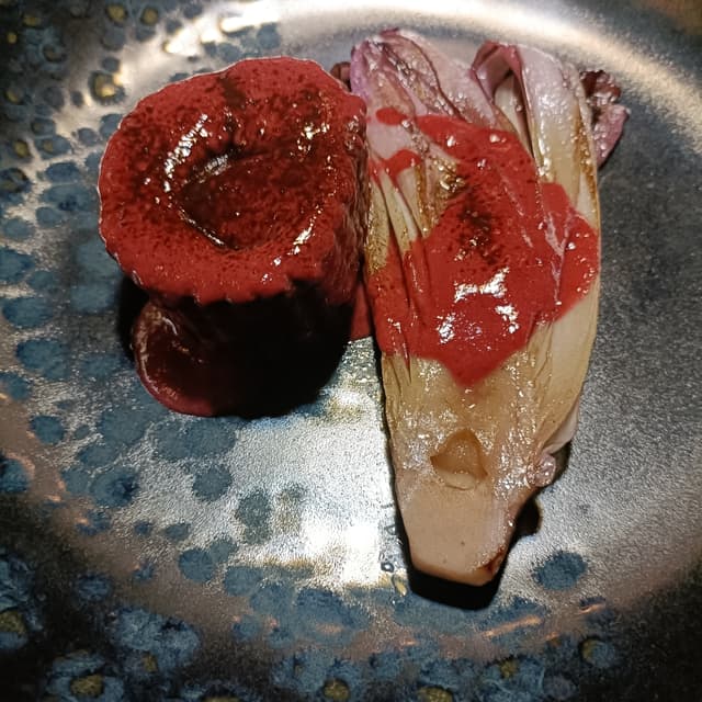 Filetto di seitan con crema di lampone e liquirizia, accompagnato da radicchio tarfivo igp.