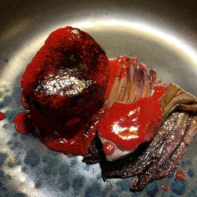 Morbido arrostino di seitan ai lamponi, ginepro e alloro servito con radicchio rosso di Treviso IGP e polvere di liquirizia. La salsa ha un sapore molto deciso, non indicata per gli amanti dei piatti delicati.