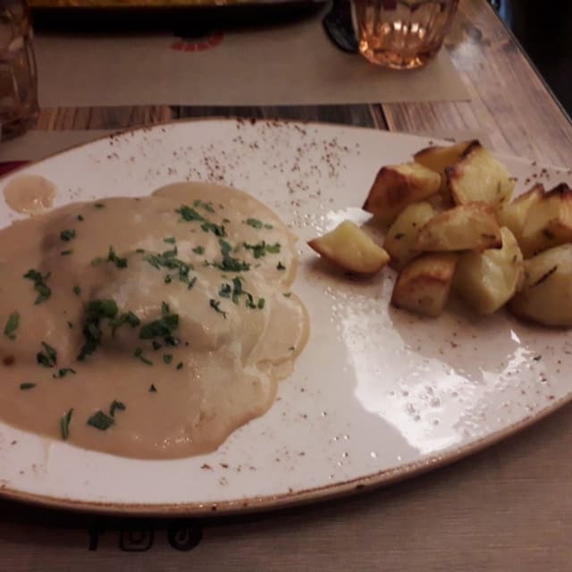 Assolutamente da provare! Non avevo mai mangiato questo piatto tradizionale in versione classica ma sono rimasta senza parole per questa versione vegana. Le fettine di seitan erano strepitose, sottili e morbide senza il tipico effetto gommoso, il prosciutto saporito e affumicato e una ricca crema formaggiosa hanno reso un sapore spaziale. Accompagnato da patate al forno buonissime e ben speziate. Ne avrei mangiati altri mille