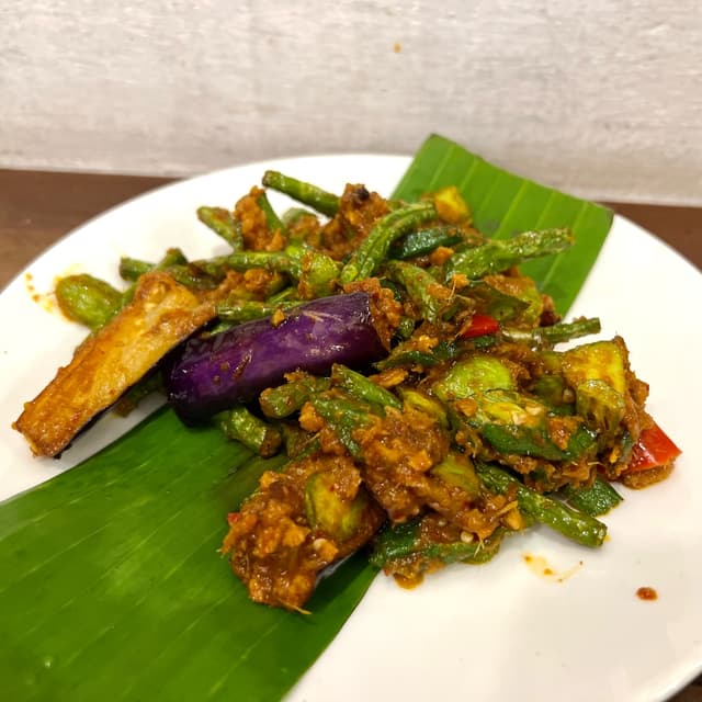 comes with the usual 4: brinjal, long beans, lady's finger and petai. super tasty! wish there was more petai
