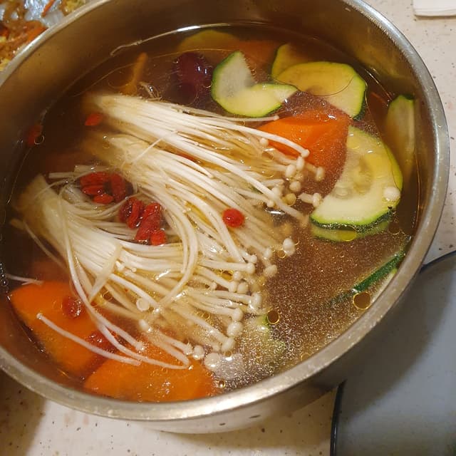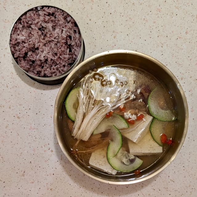 Ginseng 'chicken' soup with natural unprocessed ingredients such as lion's mane mushrooms, enoki mushrooms, tofu, and sliced zucchini in lieu of chicken or mock meat. 🍲🍄 The broth was cooked with ginseng, red dates, goji berries, and assorted herbs; definitely nourishing though it leaned towards being slightly bland in my opinion oops. Portion was on the smaller side too. (Especially compared to the menu picture depicting a bowl that was filled to the brim, expectation vs reality moment there teehee 👀) Came with wholegrain rice! 🍚 P.S. I visited during the opening week, so they might have been having teething issues; I believe they will keep improving~ 🤗 (Allium-free, $14.90) #sgvegan #koreanfood #alliumfree #wholefoodplantbased #wfpb