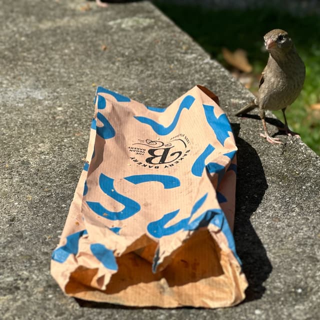 I didn’t want to actively feed her because baked goods might not be healthy for sparrows. But she did manage to grab a few stray crumbs for herself and her two babies. 😍😍😍