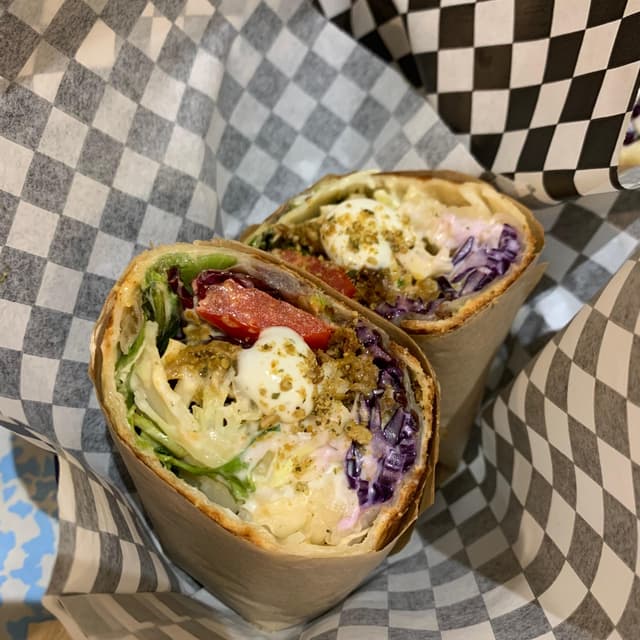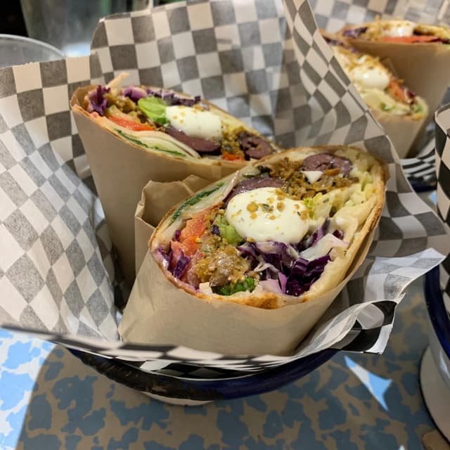 Muy rico. Algo salado ya que traía bastantes olivas. Aún así la lechuga y el tomate rebajaba. La masa del wrap muy buena. Wrap de seitán marinado con col lombarda, hojas, tomate fresco, pepinillo, feta, kalamata y salsa yogur / 7,9€ Todos los ingredientes son veganos.