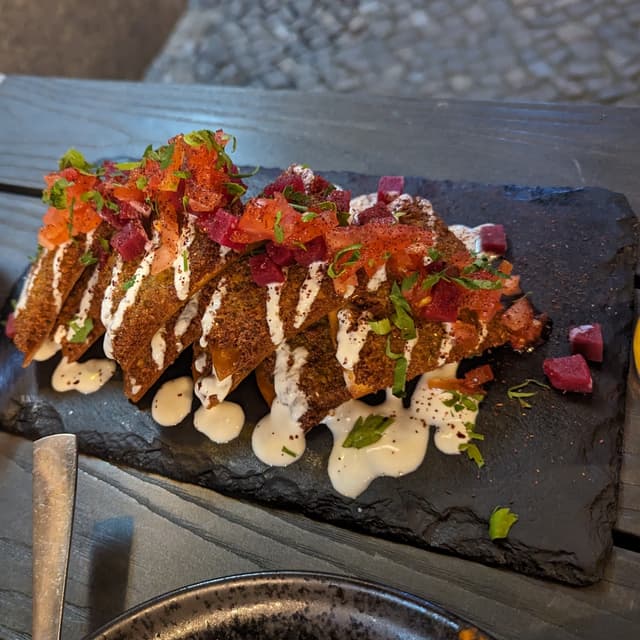 Modern Levantine Cuisine with a really original Twist - includes Falafel Nachos, deconstructed Baba Ganoush, Mezze/Muhamara Tower, Breakaway Fatoush, Shawarma-flavour potatoes (vegan - in picture) and 15-hour potatoes (the best I've ever had - and I'm quite anl serious foodie!). De-licious!!! 👌💯