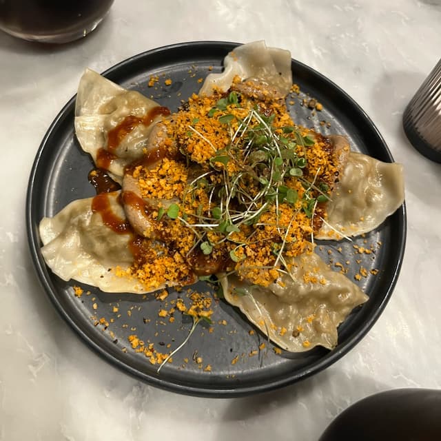 Delicious dumplings - “Braised shiitake, baked tofu, spinach, dark soy, porcini mushrooms, chili panko, micro arugula, shiitake truffle and spicy bean sauce” - description from the online menu. #dumplings #mushroom #shiitake