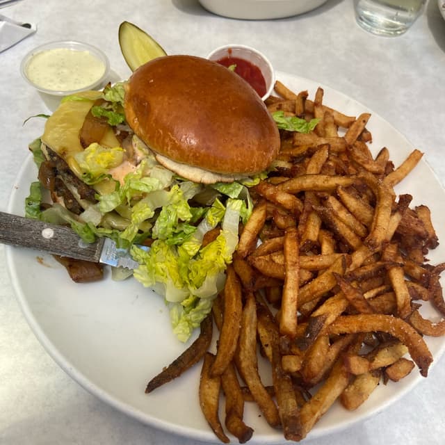 Still my favorite smash burger I’ve ever had. Handlebar does a homemade patty with beans, mushroom, and quinoa, topped with cheese, pickles, lettuce, and their secret sauce. Their fries are always out of this world, and don’t forget their ranch for dipping!