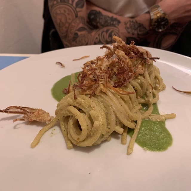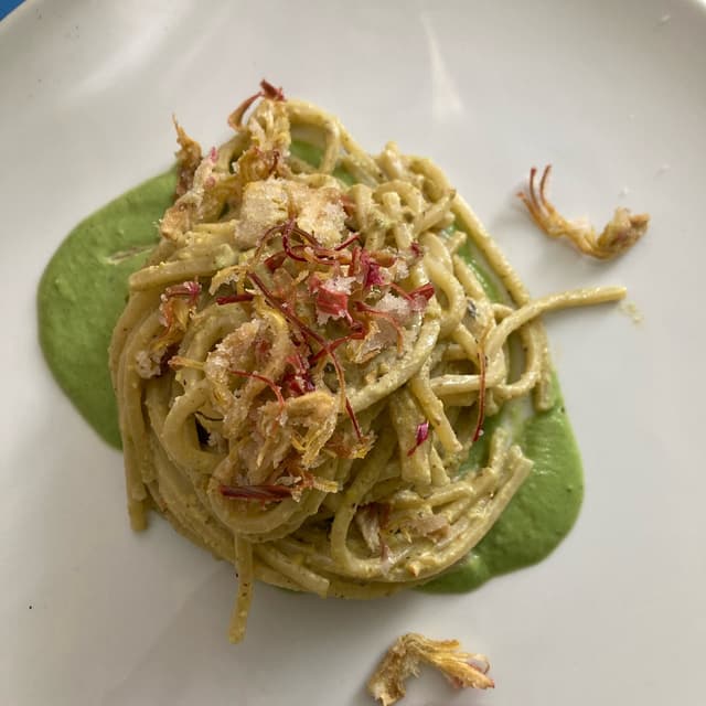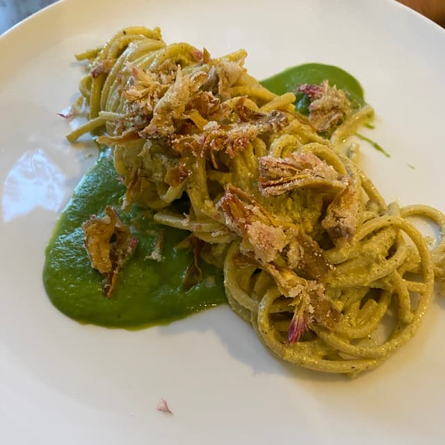 Spaghetti con crema di piselli e pistacchio con carciofi fritti gustato alla casina di Alice a Livorno. Piatto gustoso e originale e presentazione impeccabile, unica pecca i carciofi fritti che erano davvero troppo duri, ma il piatto in generale buono😌