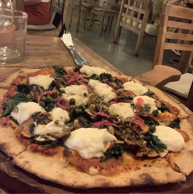 A delicious and warm, thin-crust pizza. I had the cooked and gluten-free version, which was pretty satisfying. Maybe I could have left one or two slices for takeaway 🍕🥡. The melted mozzarella cheese was delicious, and the tomato sauce was flavourful and salty. This is the menu description: “Thin spinach crust topped with mushrooms, spinach, pickled shallots, capers, and pili nut cheese.” The only thing I did not love was the capers and perhaps adding a sweet ingredient to the mix wold be intresting. I loved the restaurant; the wifi password is “Jesuswasvegan.”
