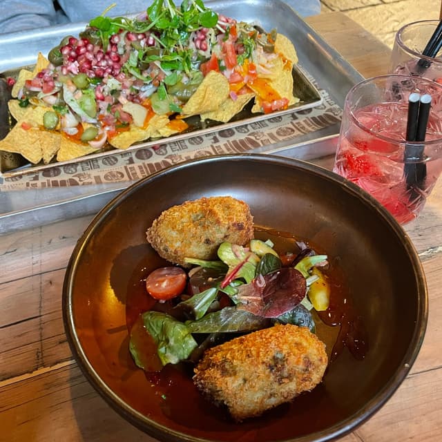 The nachos are lovely! Don’t have cheese on and you don’t miss it because the salad on top of so refreshing in itself!