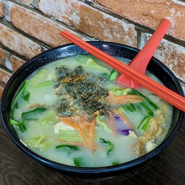Soup brimming with spinach-infused green mee hoon kueh noodles, organic leafy greens and shredded carrot, chunks of fried soy fish, as well as fried seaweed chips. So impressed to see a dish with vegetable-infused noodles and organic vegetables at such a reasonable price! Very flavourful and one of the healthiest dishes in the menu, albeit still with fried ingredients. Personally would have preferred not to have the fried seaweed chips or to have it served on the side instead, as it got soggy very fast in the soup. Would love to have more dishes in the menu with vegetable-infused noodles, like pumpkin noodles, etc. (Allium-free, $7) #sgvegan #organic