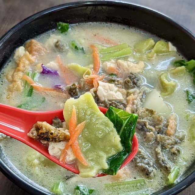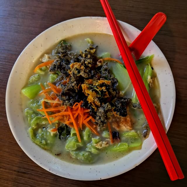 Looks like a mess but it tastes soo much better than it looks haha. Hand made thick green spinach kway with lots of soy and mock meat ingredients. Best part is the soup, really savoury and gingery. Ate it twice in a row HAHAHA