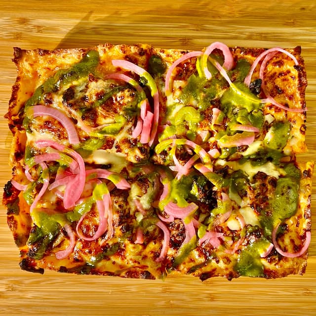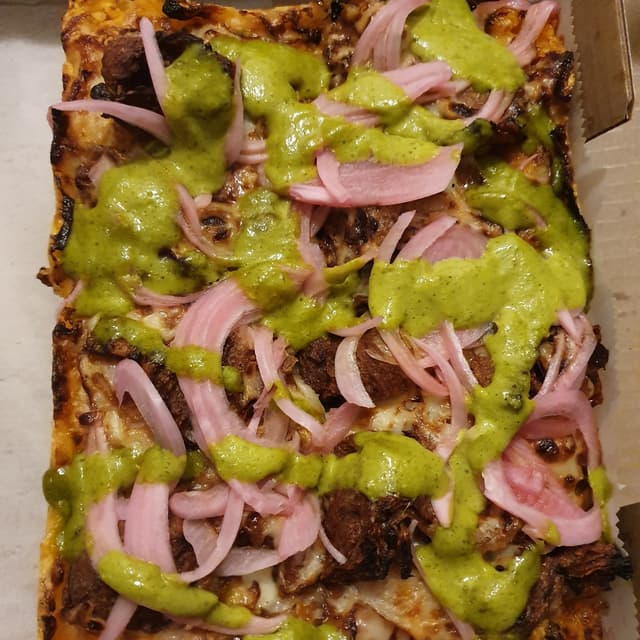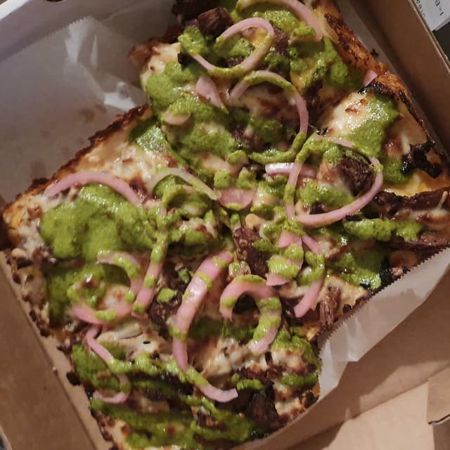 One of the best pizzas from Boxcar! Mozzarella, Cheddar, Steak, Pickled Red Onions, Cilantro Lime Aioli. 100% vegan. #veganisnotscary #veganin2024 #pizza #veganpizza #ditchdairy #vegancheese #dogsofabillion
