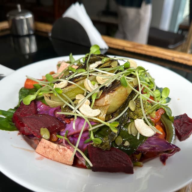 yasminahammoud2 years agoSee TranslationThis dish is packed with all the healthy nutrition you need. It is served with tofu, cashews, beetroot, bok choi and other veggies. The owner is very sweet and cares about presentation. #veganbowl0
