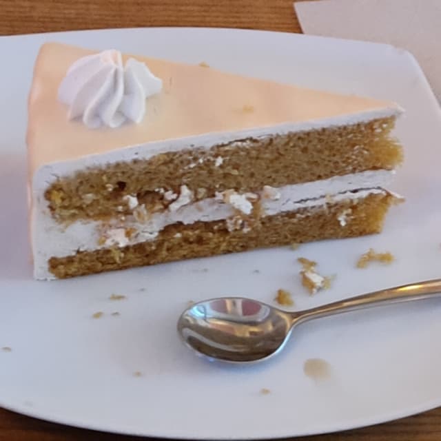 Muy buena. No se ve bien en la foto pero tiene un bizcocho de vainilla abajo y crema de chocolate blanco encima, cubierto de chocolate blanco.