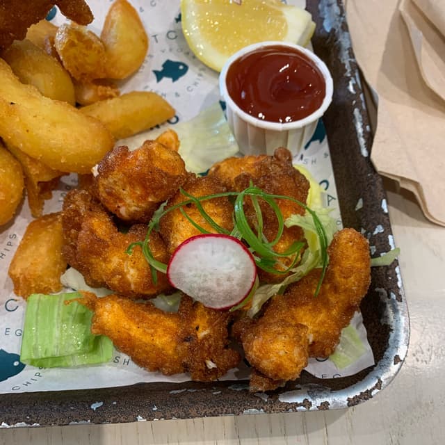 #sweetdreamsaremadeofgrease heaven! i couldn't just walk by a vegan fish and chips place. i dont like nori so opted for the #tempura shrimp. the #fries / #chips were great. i got aioli sauce -it went perfectly with everything. #100percentplantbased restaurant. they make their own batter but buy the products. two customers let me take a photo of their fish and chips (foto 4). They got a regular and a large order. for being across the street from the sea in a touristy town, the prices aren't bad. #supportlocal