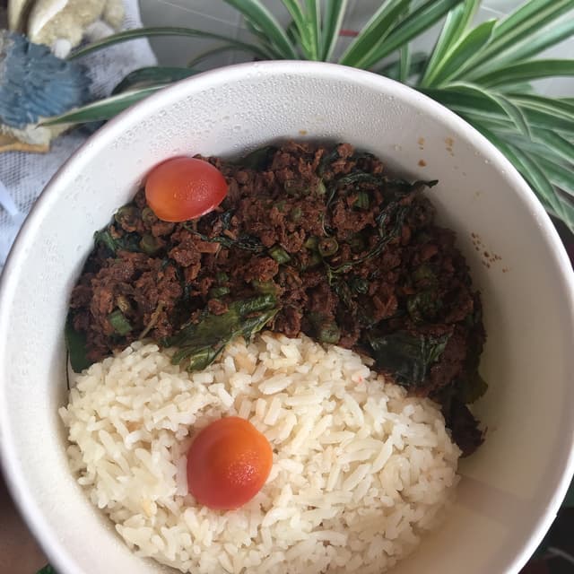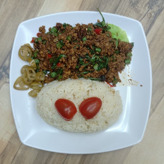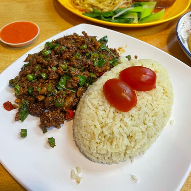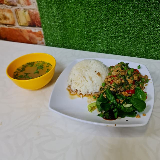 One of the best I have eaten. Very tasty and not overly salty. Love the thai basil leaves and bird's eye chilli in it. The mock mince made of soy had a good bite and absorbed the flavours well. Served with some sauteed greens. The rice was some sort of sesame oil rice. Good price at $5.80.