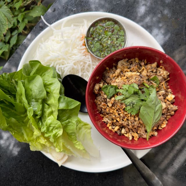 Crisp lettuce leaves, a mix of shiitake mushrooms 🍄, tofu and lemongrass for the filling, crispy rice noodles and cilantro to sprinkle on top, with a Vietnamese sauce for the drizzle!!