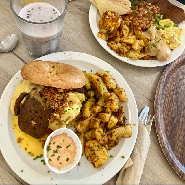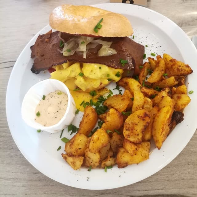 Super buono, anche se non siamo ben sicuri di cosa abbiamo mangiato In sintesi era un bagel con uova, bacon, formaggio e salse con patate speziate Ma non sappiamo minimamente di cosa fossero fatte le uova strapazzate e il bacon, il formaggio invece mi sembrava a base di olio di cocco
