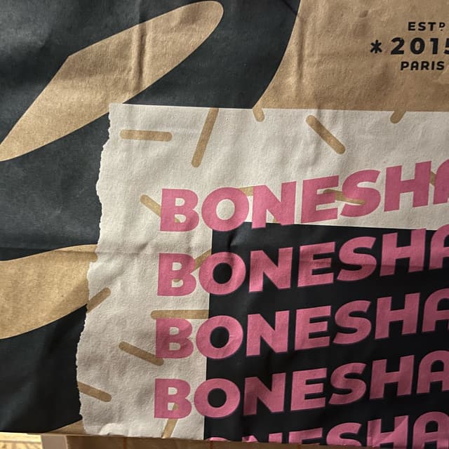 Je suis allée chercher des Donuts de Boneshakers. Cette boutique propose des donuts propose des produits 100% vegans, faits maison. Ils conseillent de déguster les donuts le jours même de la fabrication. Prix abordables compte tenu de la taille des donuts. OG (3,7€), dégusté le lendemain matin (conservé au réfrigérateur) et il était toujours moelleux. Ce donuts est le plus simple, nature avec du couche sucrée glacée sur le dessus. C’est celui que j’ai préféré, moelleux avec un bon goût de beignet. Sucré juste comme il fait.b