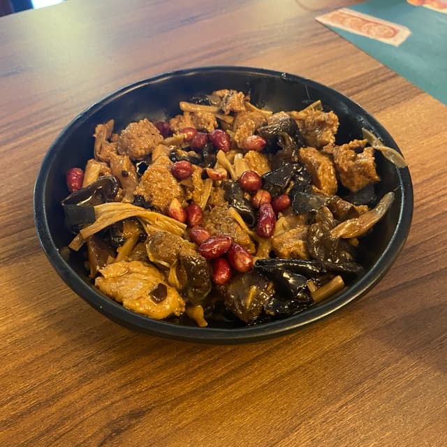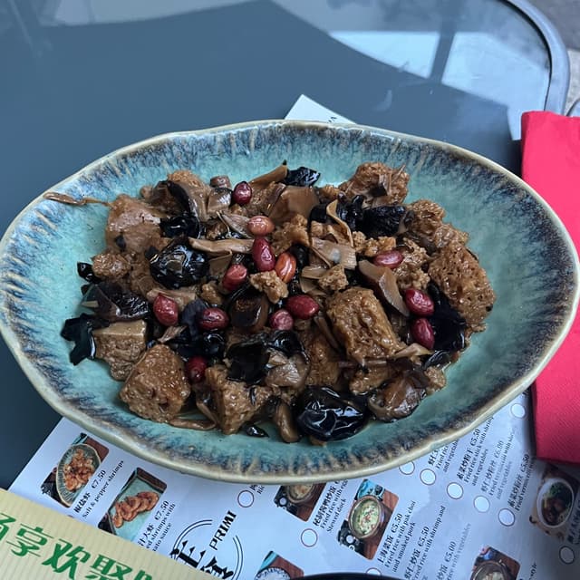Tofu con funghi e arachidi. Il tofu molto morbido e saporito, i funghi insieme ci stavano molto bene. Questo piatto semplice ma mi è piaciuto molto!