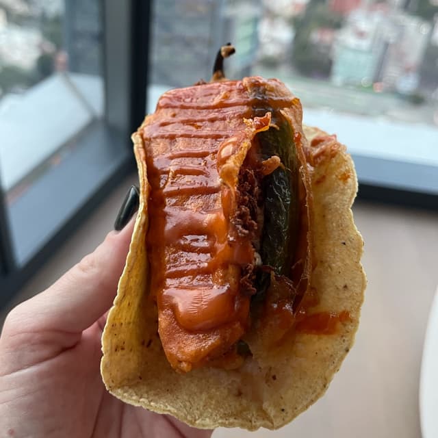 What a bomb idea! Battered jalapeño #pepper stuffed with #plantbased seafood stew with #cheeze in a tortilla with chipotle sauce 🫑 spicy, but not too much, and just a genuinly fun mix of textures and tastes. Only in #Mexico !!🇲🇽
