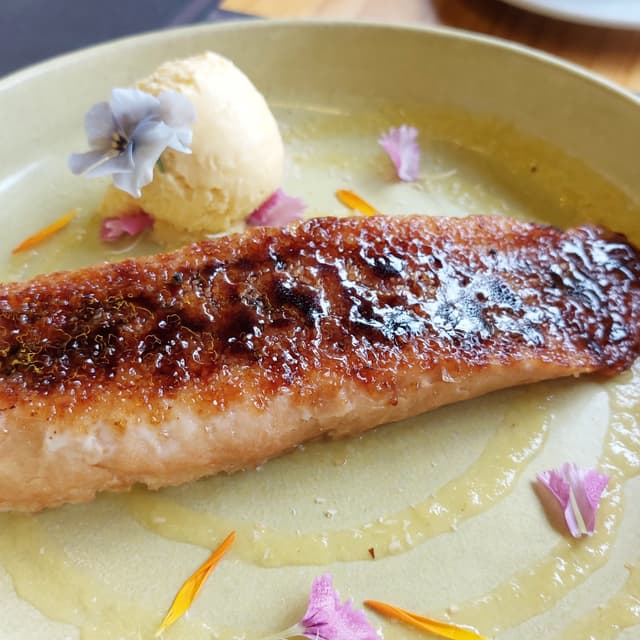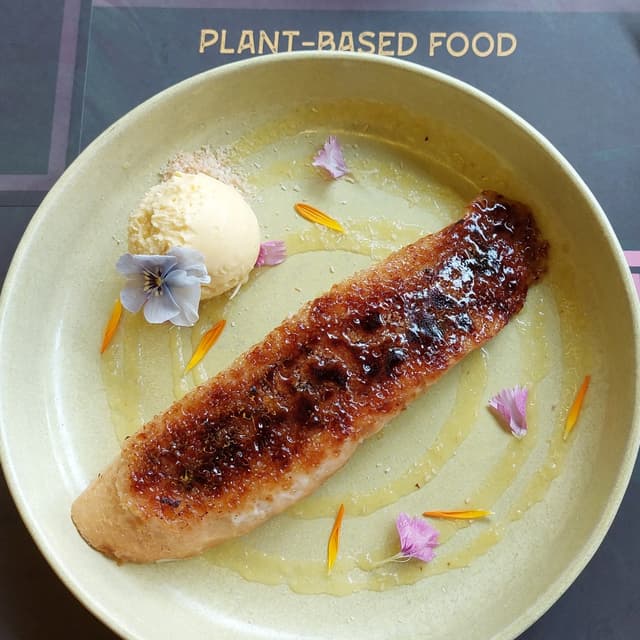 El plato es UNA PASADA, ¡sublime! 🤌🏼 Según la carta, es una "torrija de piña colada con helado de mango-maracuyá". Cuesta 7 euros y es una fantasía como merienda o como postre. 😍🍍🥭 Me encanta, el sabor de la torrija es espectacular y el toque crujiente del azúcar de encima la hace única. El toque del helado y el puré de fruta que acompaña la torrija es espectacular. 💚 Un gran plato, único en su especie. Recomendable para todos los paladares. #tradicional #fusion #postre #merienda #torrijas #torrijavegana #madridvegano