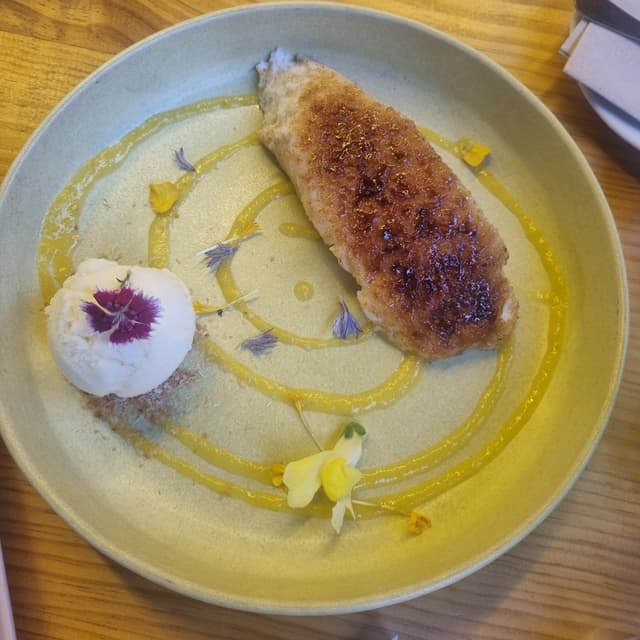 La mejor torrija, jugosa, con azúcar quemada por encima . Expectacular