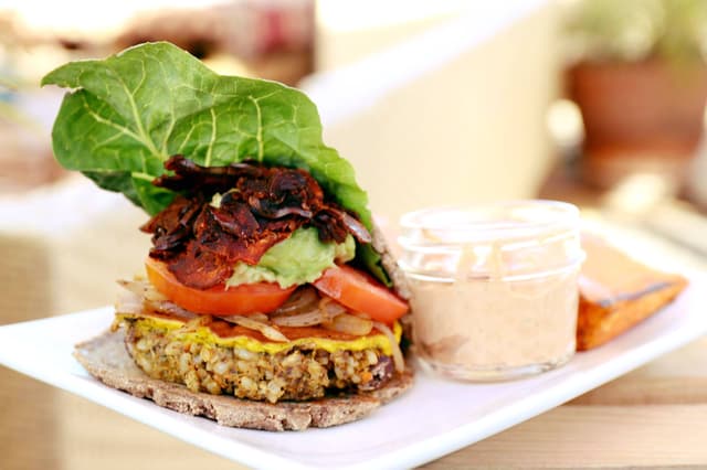 A tasty, filling vegan burger made with brown rice, bean & portobello mushroom grilled with cashew cheeze. Topped with fresh tomato, lettuce & caramelized onions. Comes with a side of sun-dried tomato cashew aioli (my fav part because I am such a sauce person lol!) & sweet potato wedges.