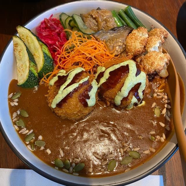 This Japanese curry was amazing especially the croquettes (only two though). Served with roasted veggies, pickles, brown and black rice (looks more like purple rice). New favourite 😍