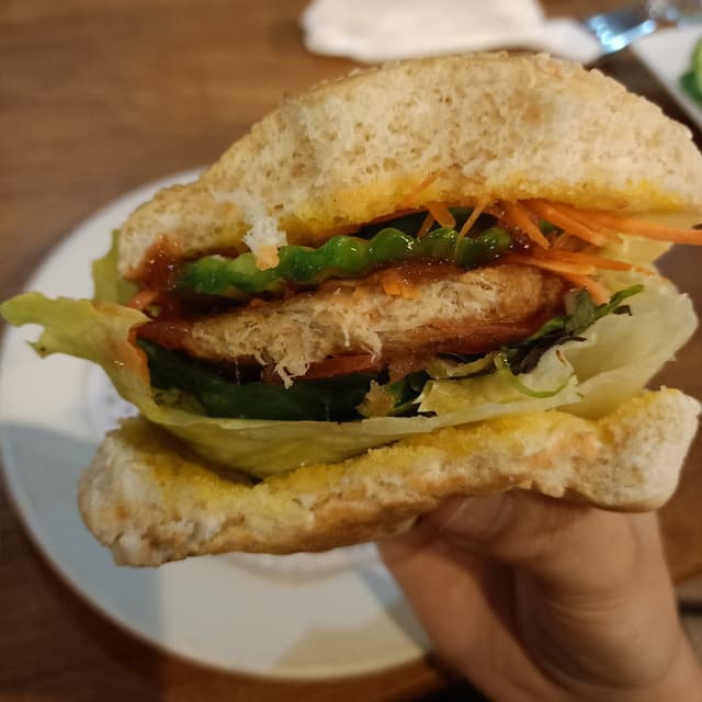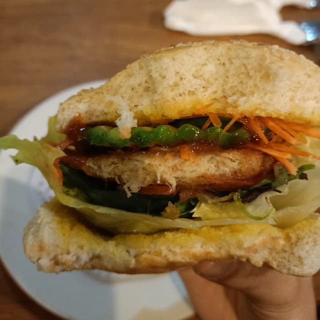 Vegan Chicken Burger at Sunflower Thai for ~$9. This was before lockdown. And before they had a change in ownership with a menu revamp. Doesn't look like much from a first glance but it was a decent lil burger. Big lettuce leaf, carrots cucumber, tomato, and chicken patty. Would have loved if the burger buns were toasted and crispy. [Donating to Clafira.]