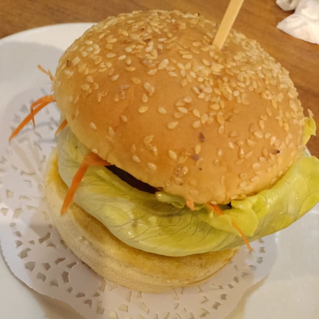 Tasty burger made with mock chicken and fresh salad on a sesame bun.