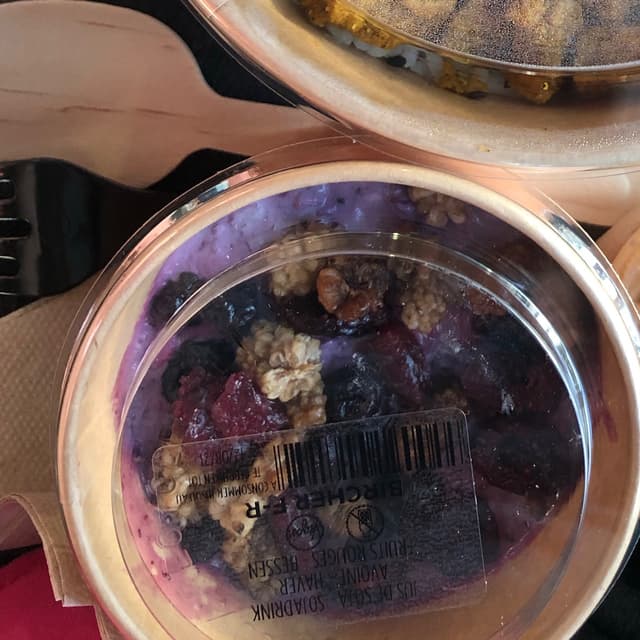 Da exki fate attenzione alla scritta vege e veg! Il primo indica che il prodotto sia vegetariano (per i dolci mi sembra un’indicazione superflua) e il secondo che siano vegani. Quindi se apparentemente hanno tutti l’indicazione con la V verde, bisogna distinguere quella chiara da quella scura (vegana). Un po’ una delusione anche questo dessert a base di soia, fiocchi d’avena e frutti rossi lasciati così sopra. Preso più per gola (e perché era l’unico vegano) che per altro.