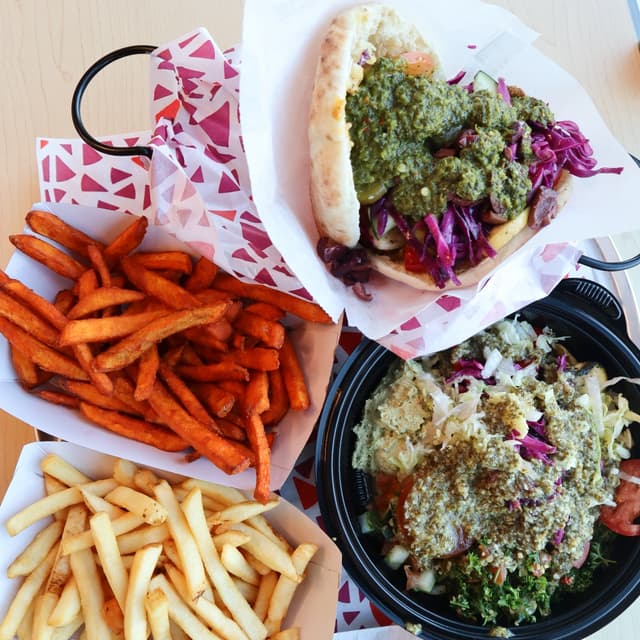 This Vegan Meatball Pita was great! We chose the white pita as our base and stuffed it with spicy pepper hummus and #vegan meatballs. They give you a lot of hummus! For our hot fill-in, we chose the seasoned and grilled vegetables, and then we added tomato, cucumber, pickles, olives, and red cabbage. We topped it off with a flavorful vegan chimichuri garlic sauce. This pita had loads of different flavor and textures, but I prefer how the bowl comes with more fill-in options. The portion size like the bowl was very large, as you can see the pita it completely stuffed. You have to eat it with a fork. It's a great value at $10.95. They use fresh ingredients, which I'm always a fan of!