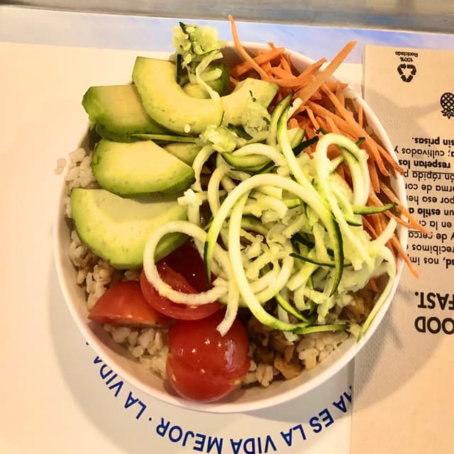 Me encanta que puedas armar tu plato al gusto, con un montón de opciones. De proteína vegana hay tofu o heura, los dos muy buenos. Solo tengo que criticar dos cosas: el aguacate una decepción (estaba muy duro, imposible de comer), y la presentacion, a mi gusto es un bowl muy pequeño y no es fácil comerlo sin que se te caigan cosas